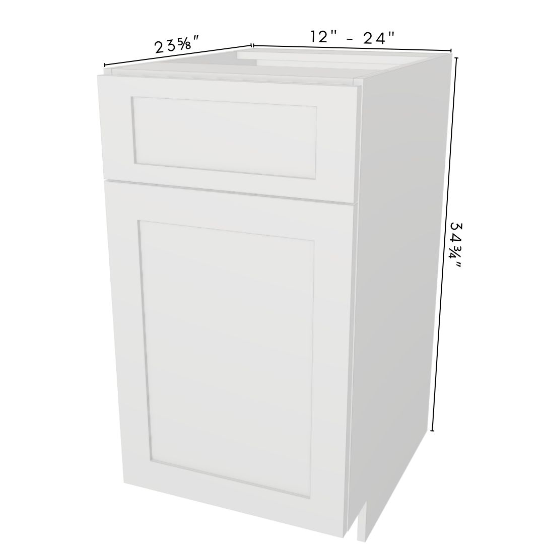 Dimensions: Custom-sized width 12″ – 24″ in ⅛″ increments | Height 34¾″ | Case depth 23⅝″ | Toe kick 3¾″ high