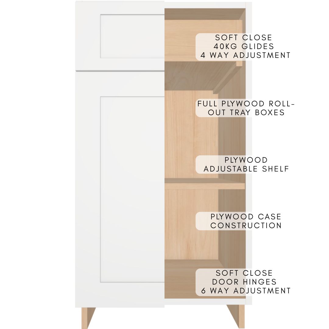 Premium fully assembled base cabinet with one drawer over a single door, constructed entirely from durable 5/8″ UV2-finished plywood for outstanding moisture resistance, strength and a beautiful long-lasting finish. Cabinet boxes are built using strong dado joints, glue and pins for rock-solid ready-to-install construction.