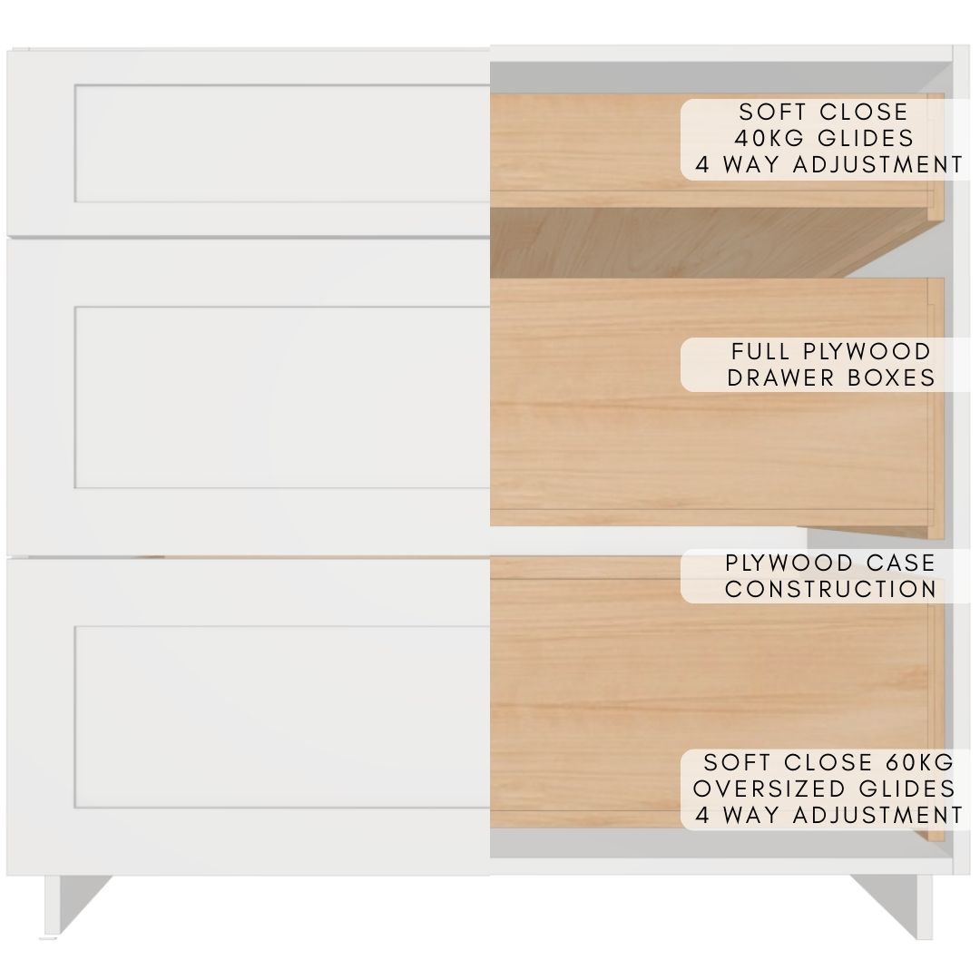 Premium fully assembled three-drawer-base cabinet constructed entirely from durable 5/8″ UV2-finished plywood for outstanding moisture resistance, strength and a beautiful long-lasting finish. Cabinet boxes are built using strong dado joints, glue and pins for rock-solid ready-to-install construction.
