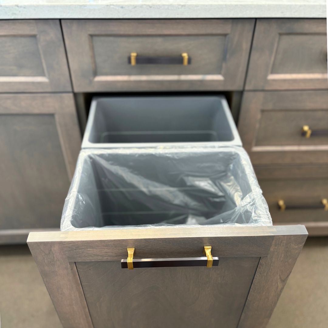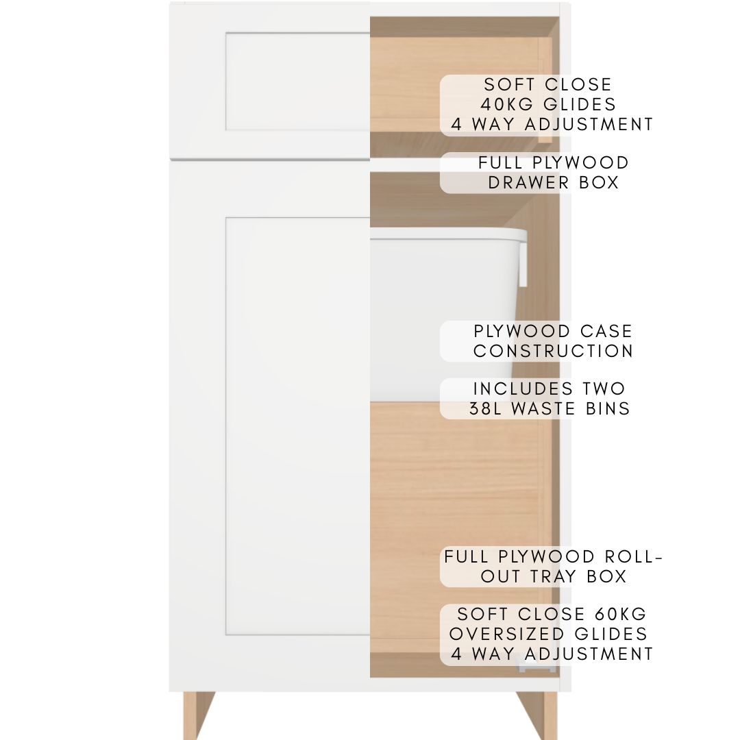 Premium fully assembled double waste-bin pull-out base cabinet constructed entirely from durable 5/8″ UV2-finished plywood for outstanding moisture resistance, strength and a beautiful long-lasting finish. Cabinet boxes are built using strong dado joints, glue and pins for rock-solid ready-to-install construction.