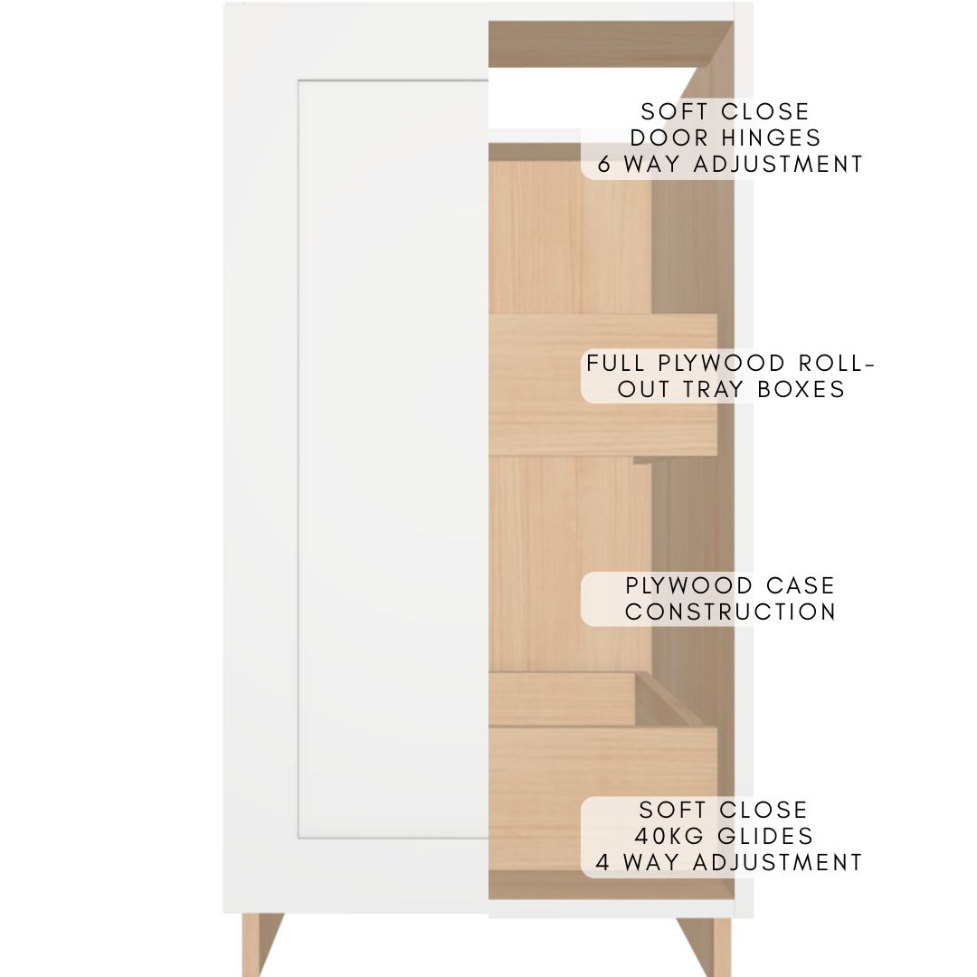 Equipped with one full-height door fitted with concealed European-style 6-way adjustable soft-close hinges for smooth, silent closure.
