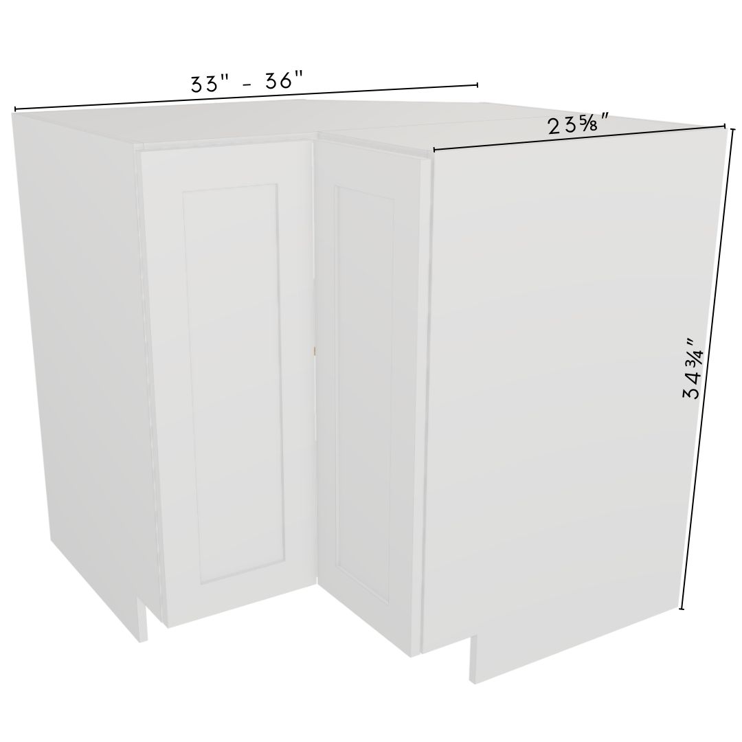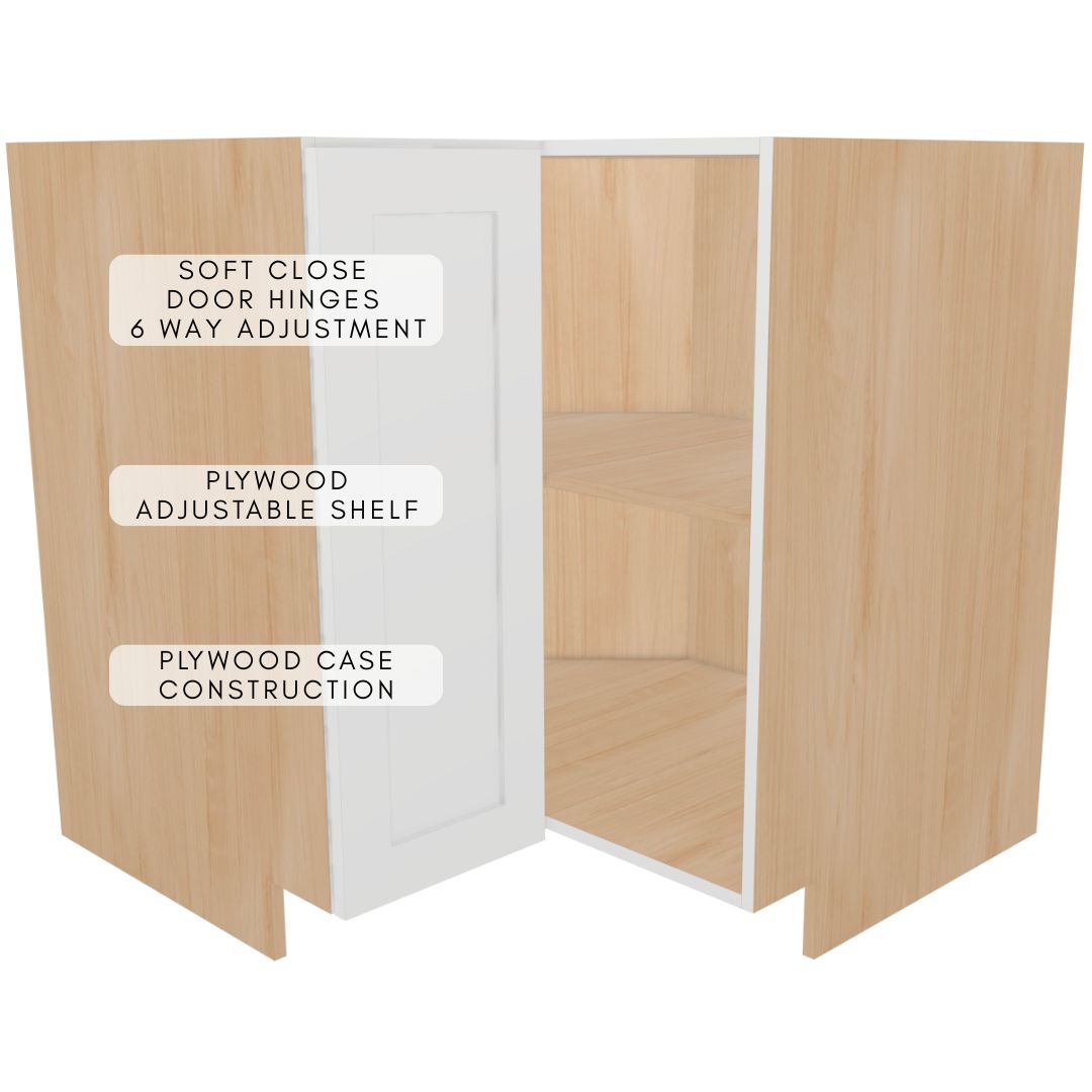 Premium fully assembled 90° corner base cabinet constructed entirely from durable 5/8″ UV2-finished plywood for outstanding moisture resistance, strength and a beautiful long-lasting finish. Cabinet boxes are built using strong dado joints, glue and pins for rock-solid ready-to-install construction.