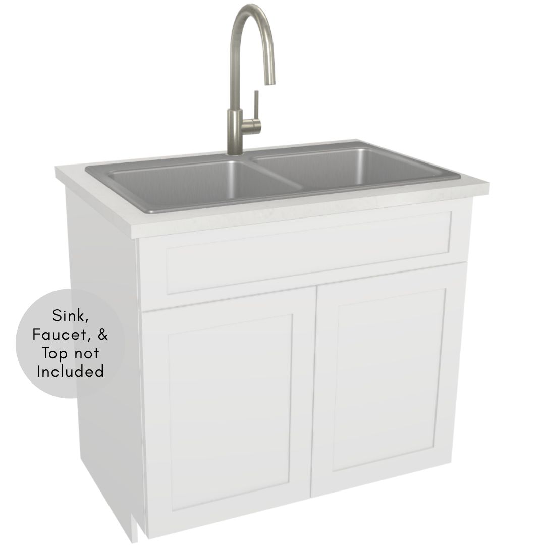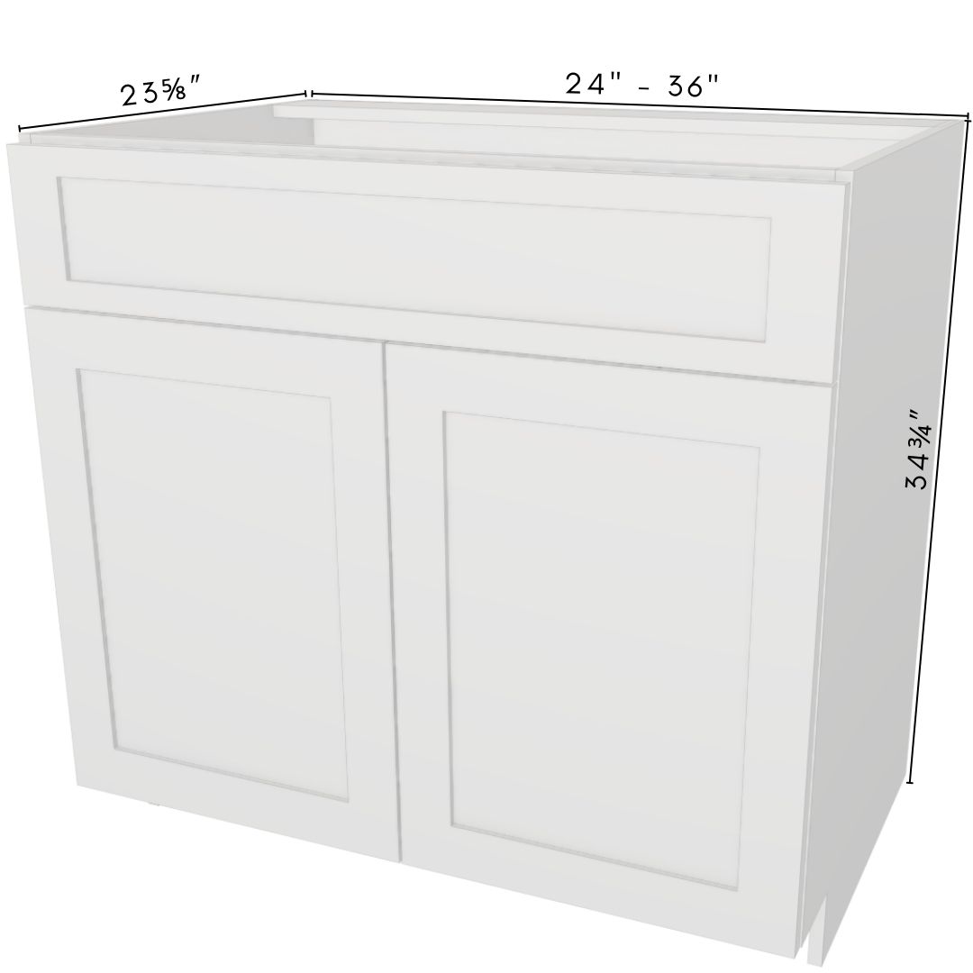 Features a 6⅞″ high false drawer front above 23⅝″ high double-doors fitted with concealed European-style 6-way adjustable soft-close hinges. No shelves for easy plumbing access.