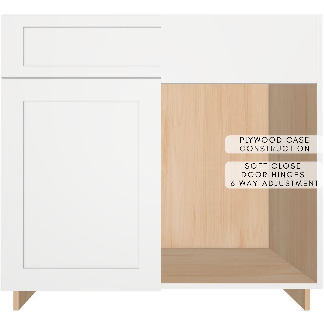Premium fully assembled single-door sink base cabinet constructed entirely from durable 5/8″ UV2-finished plywood for outstanding moisture resistance, strength and a beautiful long-lasting finish. Cabinet boxes are built using strong dado joints, glue and pins for rock-solid ready-to-install construction.