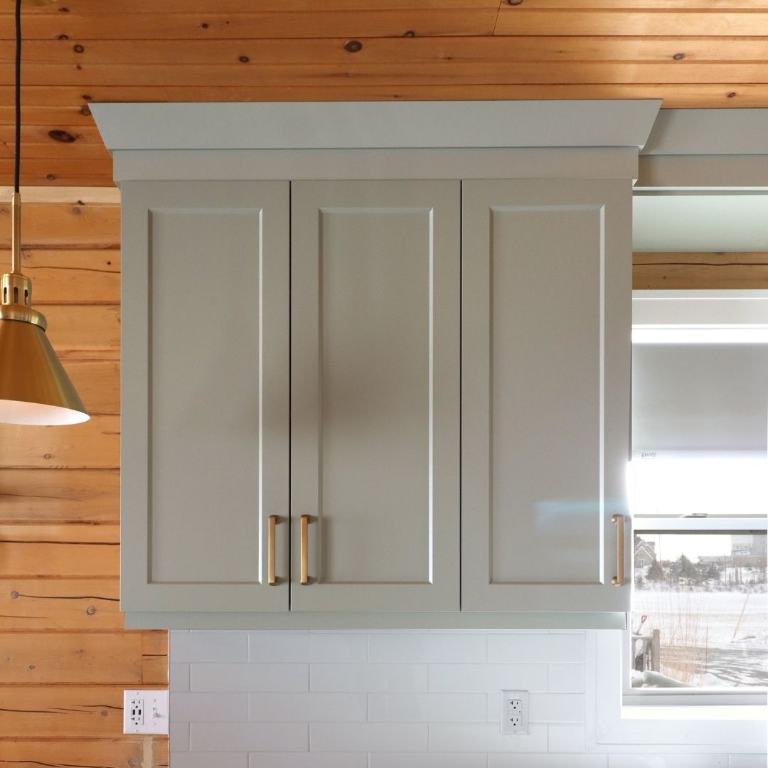 Premium angled crown moulding constructed from solid ⅝″ plywood. 3¼″ total height with 1½″ projection, fully finished on the visible front face and bottom edge for a clean ceiling transition.