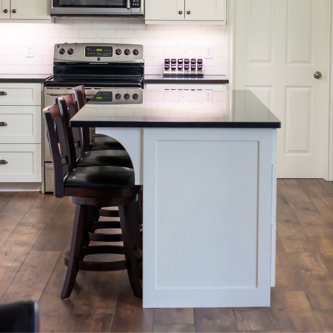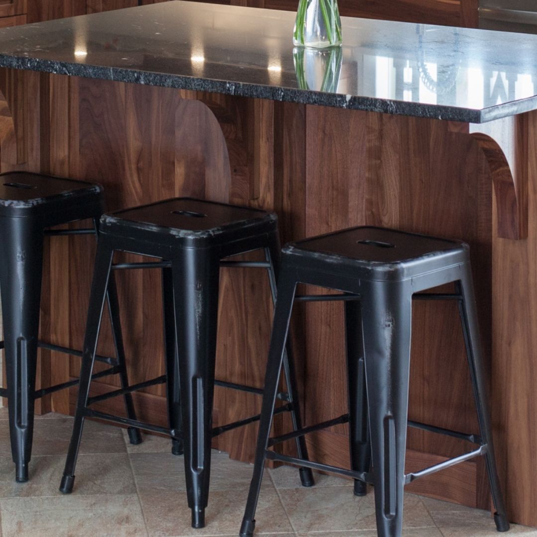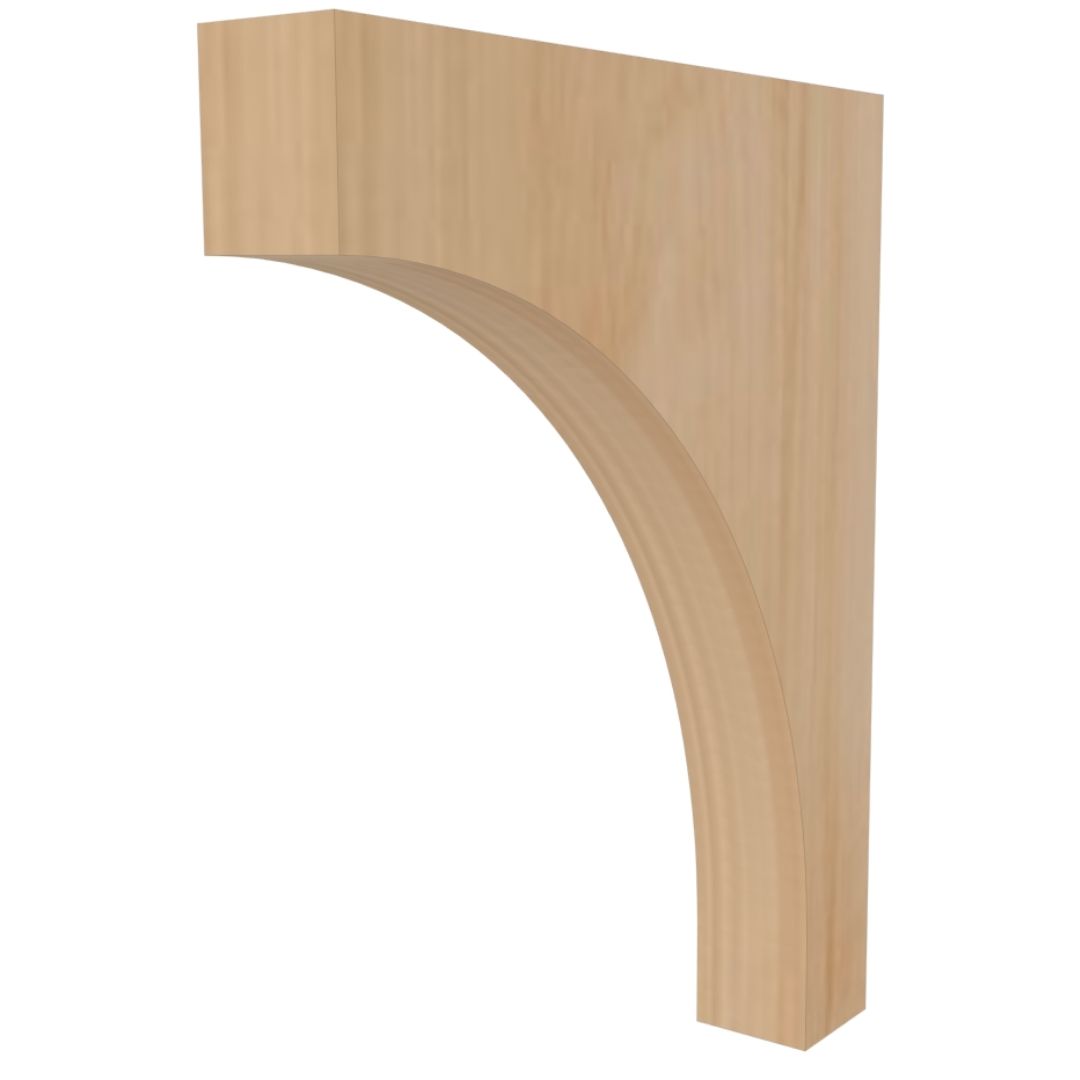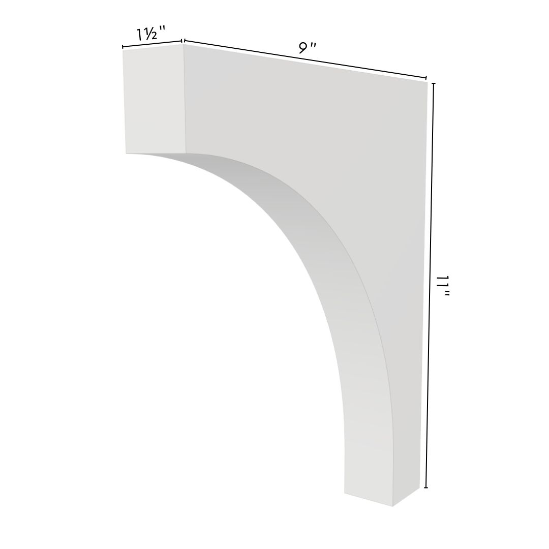Solid-wood countertop support bracket designed for kitchen island overhangs. 11″ height, 9″ projection, 1½″ thick, fully finished on all visible sides (front, top, bottom, and both ends) with the back left natural for secure attachment to cabinetry. Provides strong, elegant support for granite, quartz, or solid-surface countertops with up to 12″ overhang.