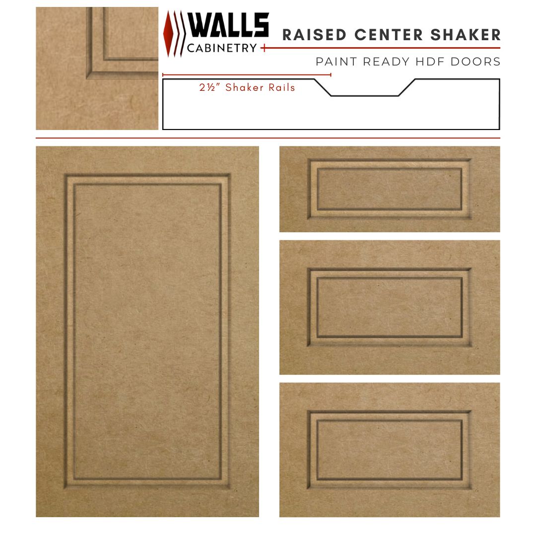 The Raised Center Shaker door features a beveled raised center and matching beveled inner frame for classic dimension and elegance. Machined from a single piece of premium 3/4″ thick HDF with a 1/4″ recessed groove. Fixed 2½” stiles and rails. Fully customizable sizes from 9″ to 36″ wide and 9″ to 95″ high in 1/16″ increments. Precision CNC-crafted and available unfinished, primed, or primed and painted in our standard paint colours.