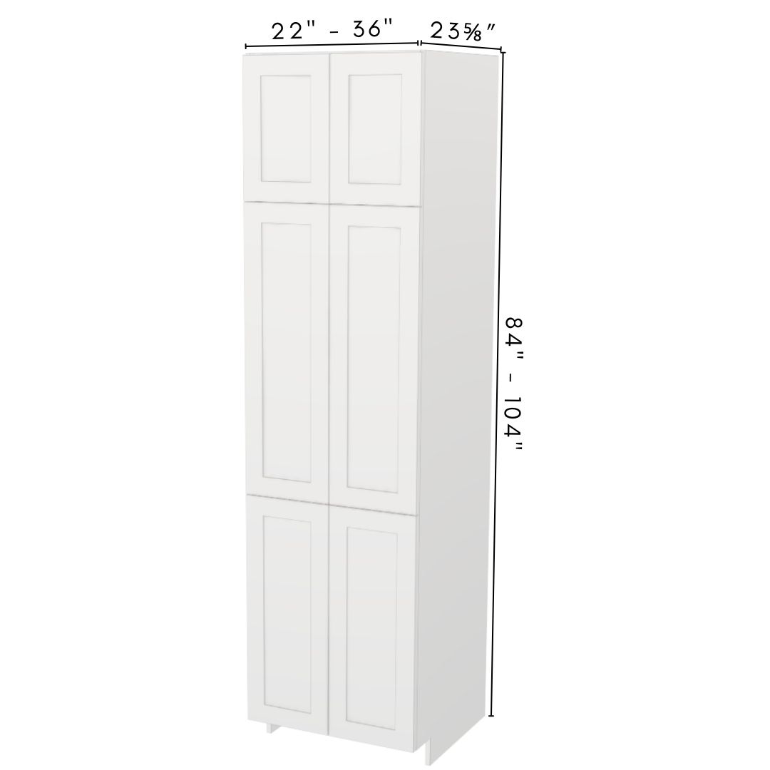 Fully assembled triple double-door tower with base-height lower section, “Large” wall-cabinet-height upper section, fixed mid-shelves, height-based adjustable shelves. Custom 22″ – 36″ W, 84″ – 104″ H, fixed 23⅝″ D.