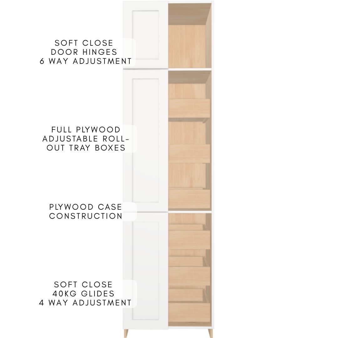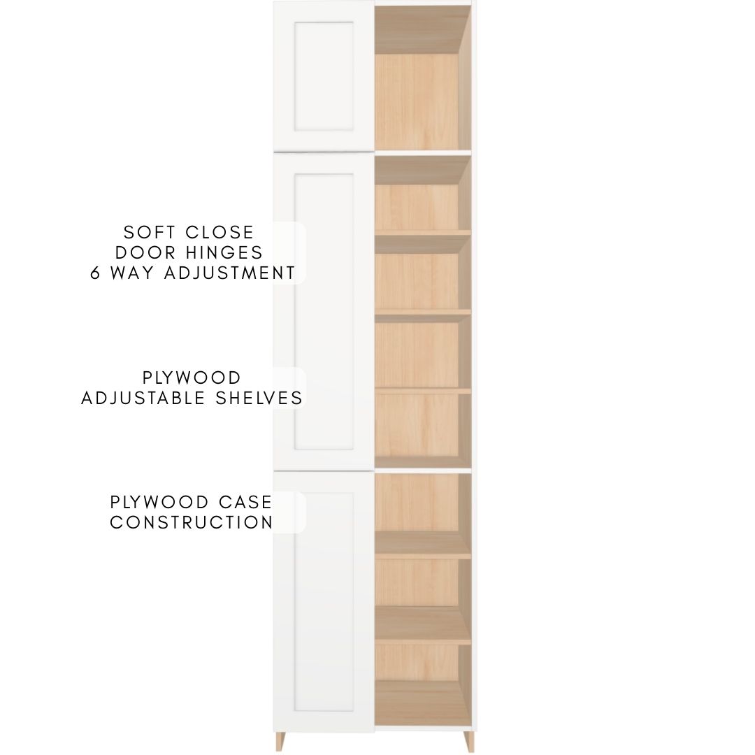 Premium fully assembled full-height tower cabinet with three independent double-door sections, constructed entirely from durable 5/8″ UV2-finished plywood for outstanding moisture resistance, strength and a beautiful long-lasting finish. Cabinet boxes are built using strong dado joints, glue and pins for rock-solid ready-to-install construction.