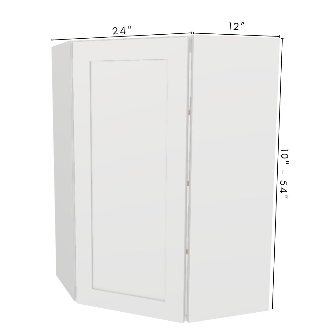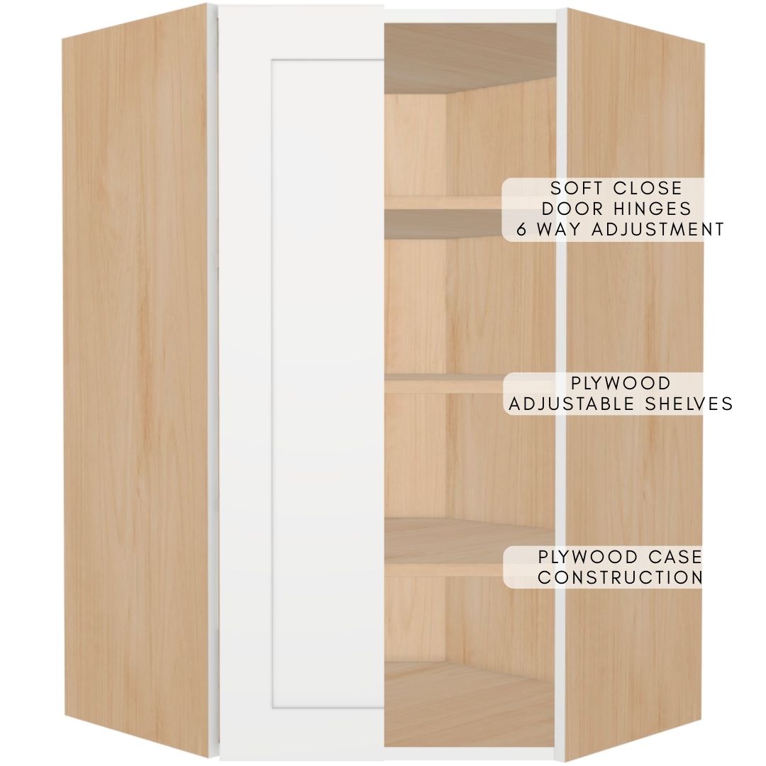 Premium fully assembled angled-corner wall cabinet constructed entirely from durable 5/8″ UV2-finished plywood for outstanding moisture resistance, strength and a beautiful long-lasting finish. Cabinet boxes are built using strong dado joints, glue and pins for rock-solid ready-to-install construction.