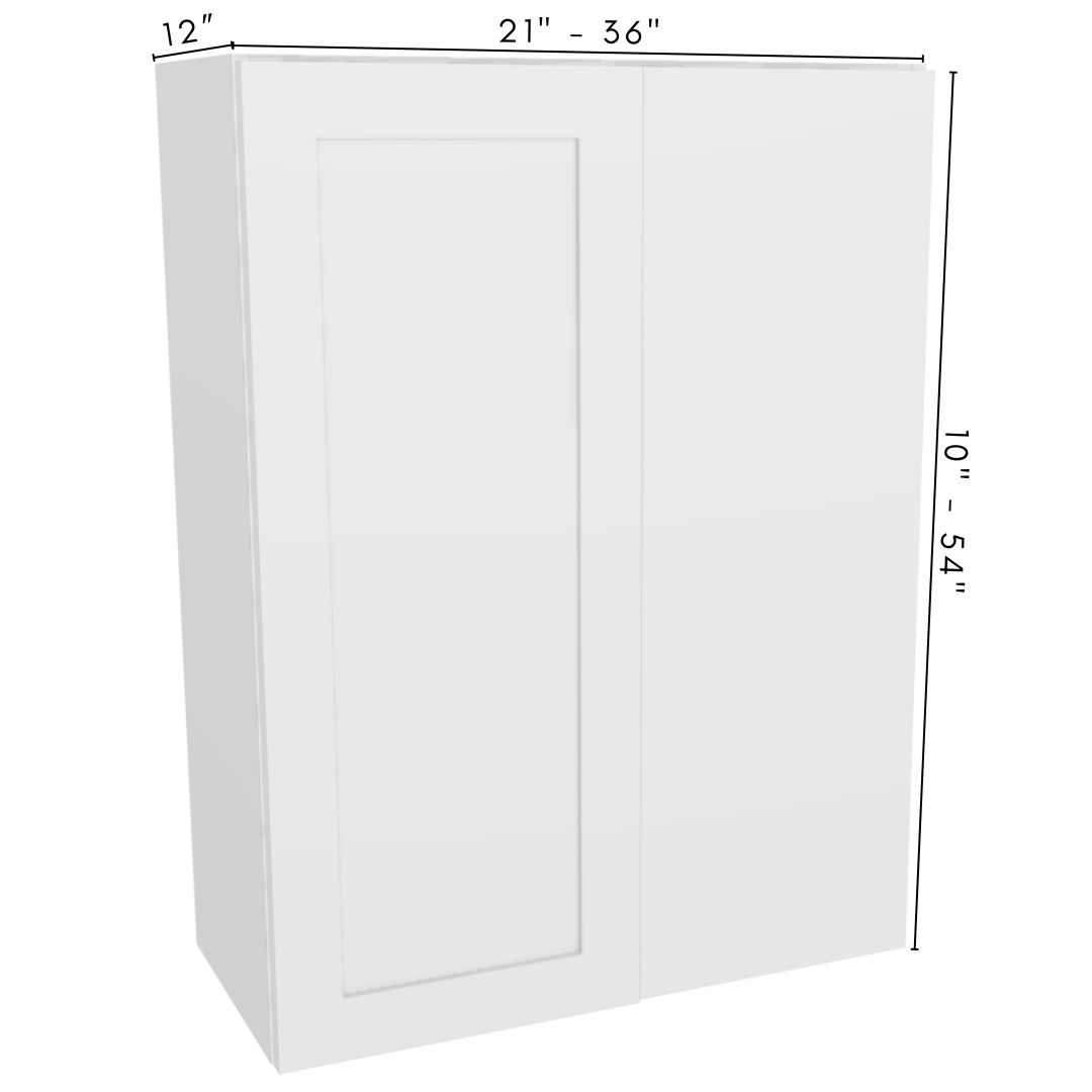 Fully assembled left blind-corner wall cabinet, finished blind panel on right, single soft-close door on left, installs 1″ min from wall. Custom 21″ – 36″ W, 10″ – 54″ H, fixed 12” D.