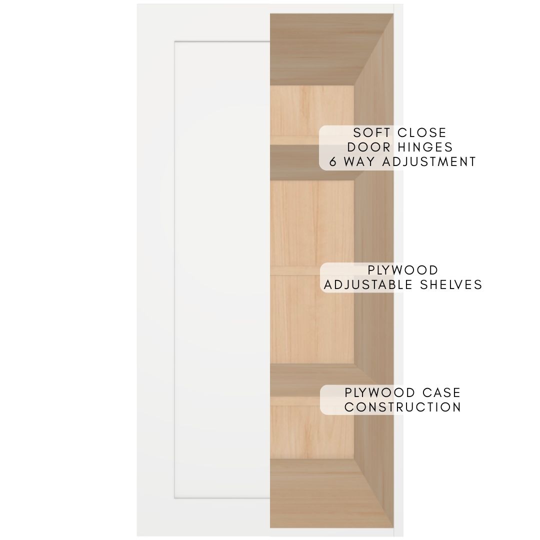 Premium fully assembled extra-deep single-door wall cabinet constructed entirely from durable 5/8″ UV2-finished plywood for outstanding moisture resistance, strength and a beautiful long-lasting finish. Cabinet boxes are built using strong dado joints glue and pins for rock-solid ready-to-install construction.